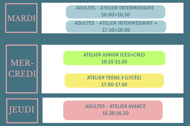 Le planning hebdomadaire des ateliers d’anglais pour les enfants et les adultes sur la période 2025-2026 à L’atelier des langues est le suivant :